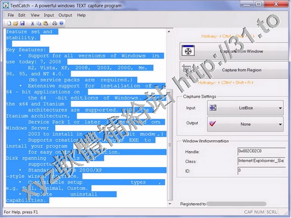 TextCatch是一款功能強大的文本捕獲工具。它可以捕獲所有Windows窗口中可見的文字,