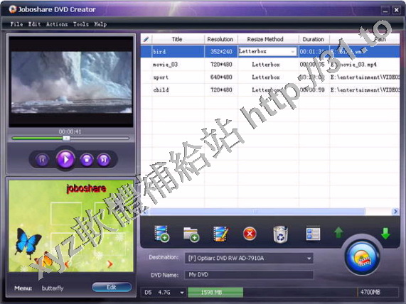 DVD影片,ISO鏡像文件和DVD文件夾。Joboshare DVD Creator可以編輯加入的視頻,剪輯指定